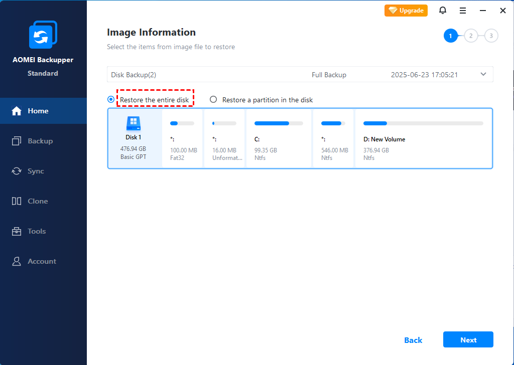 You can choose to restore entire disk or a partition in the disk, and click "Next".