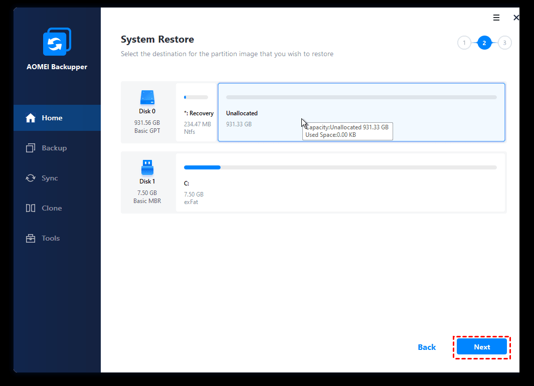 Select a restore path (Existing Partition or Unallocated Space) to receive the system image and click Next to continue.