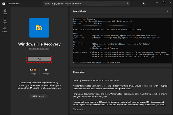 Step 1. Download Windows File Recovery from the Microsoft Store. Press the Windows + Q keys and type “Microsoft Store” to open. And then search “Windows File Recovery” and click “Get”.