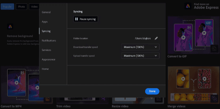 In the sidebar, go to General, scroll down, and turn off Launch Creative Cloud at login and Sync Creative Cloud files in the background after quitting. Finally, click Done.