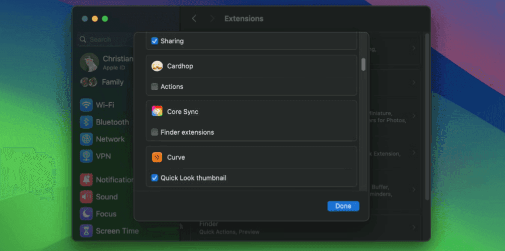 Next, disable Adobe's extension that links Core Sync with Finder. Navigate to System Settings > Privacy & Security, scroll down and select Extensions under Others, click on Added extensions, uncheck Finder extensions under Core Sync, and click Done.