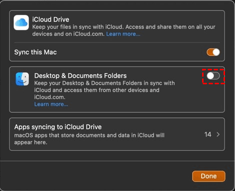 3. In the pop-up window, disable the Desktop & Documents Folders toggle.