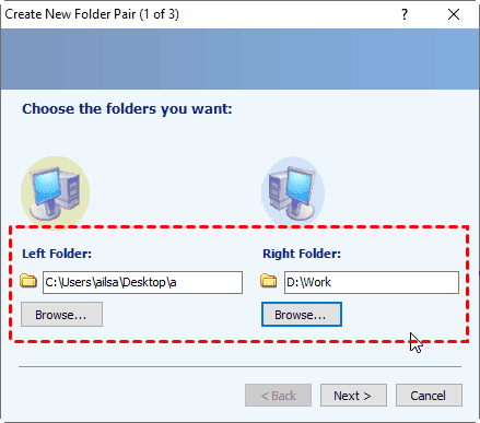 Step 2. Choose the source folder and target folder on the same computer by clicking Browse of Left Folder and Right Folder separately. Click Next >.