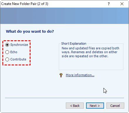 Step 3. Tick Synchronization, Echo, or Contribute as the sync method. Click Next >.