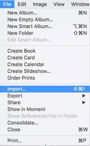 4. Go to the File menu, select Import, and a Finder window will open. Find your SD card in the Finder, select the images you want to transfer, and click Import.