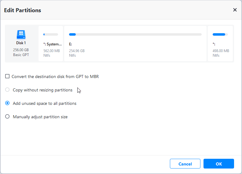 💜 Edit Partitions: you can adjust partition size of destination disk with this feature to fix the problem the cloned hard drive show wrong size issue. Also, you can use it convert disk type if the destination disk is different from source disk.