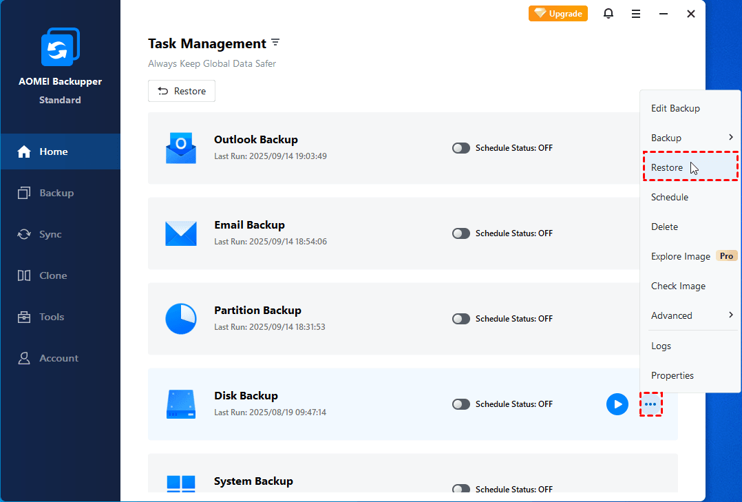 Step 1. In the Home tab, click the Restore option of a corresponding backup task.