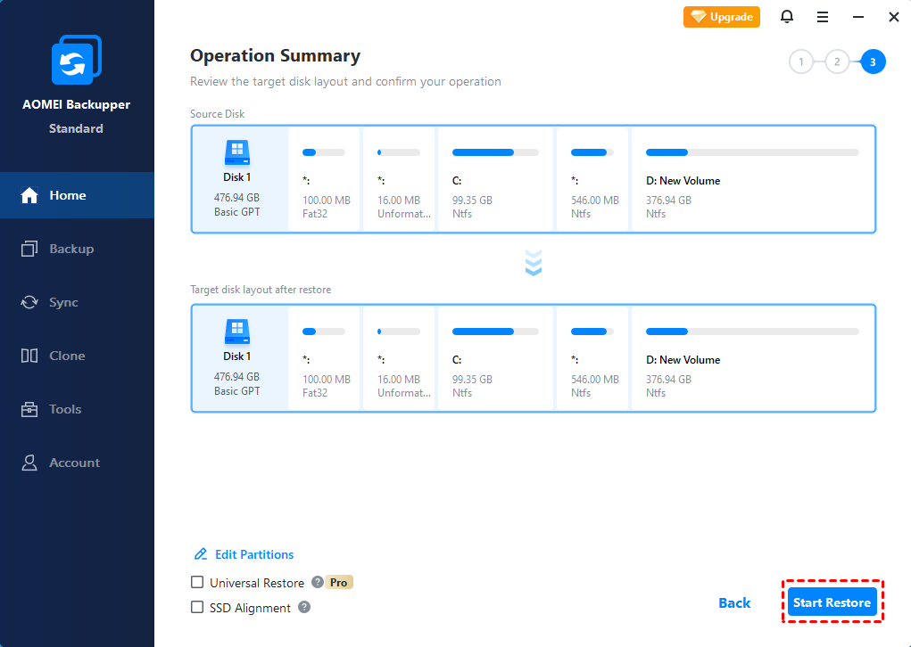 Step 3. Select HP SSD as the destination disk. Confirm the operations and click Start Restore.