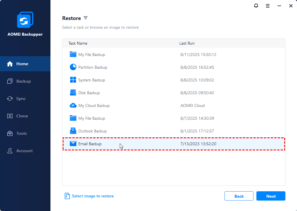 In scenarios where your iCloud emails are lost or damaged, you may need to restore them from backup. Thankfully, AOMEI Backupper presents an Email Restore functionality, facilitating the retrieval of email data to its initial state. How do I restore my iCloud Mail backup? Here are the steps:
