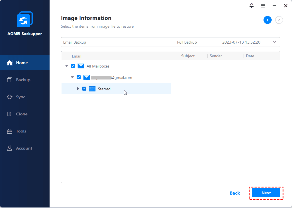 Step 3. Within the email backup list, identify and select the desired iCloud backup image file, and select the email that you want to restore. Then, click Next.