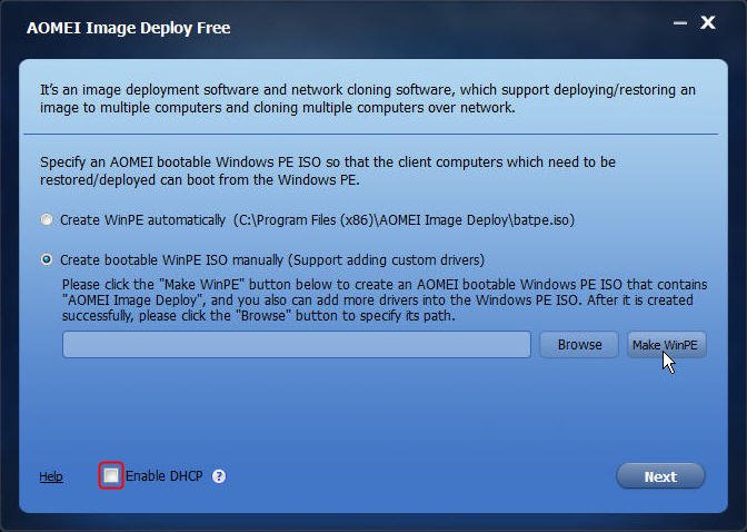 Note: To deploy Windows image over network, there must be a DHCP server in your LAN. If no, please tick the checkbox before "Enable DHCP".