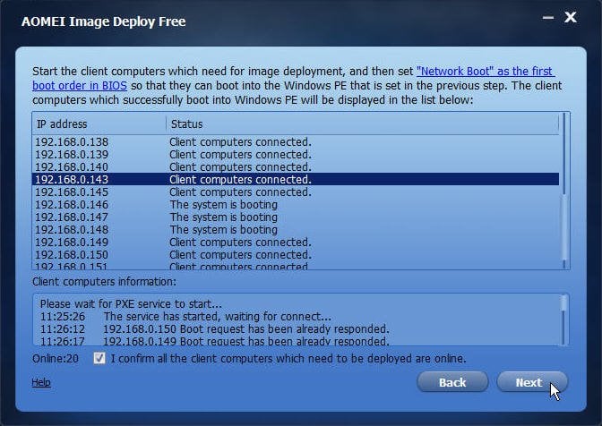 On the client computer, it will also show the local IP, server IP and connection status. When all the client computers have successfully connected to the AOMEI Image Deploy service, tick the checkbox before "I confirm all the client…" and click the "Next".