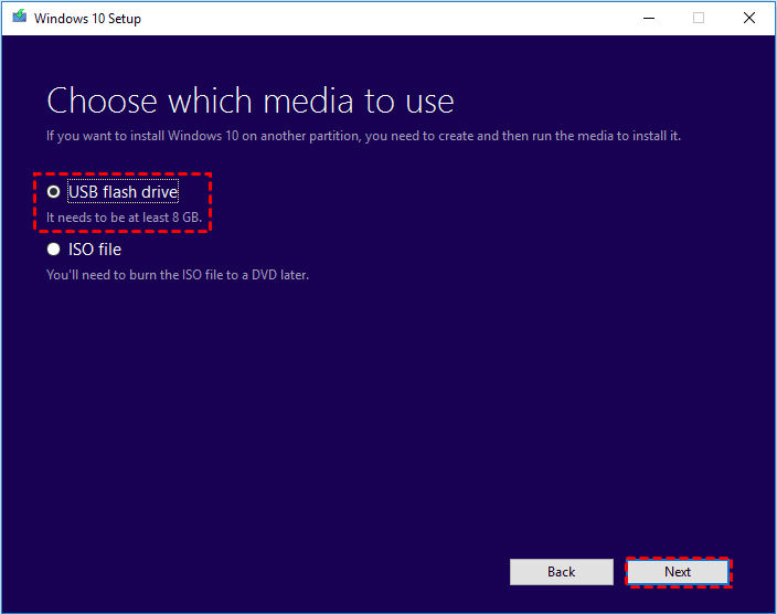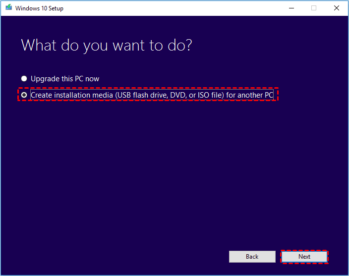 - Download and run Microsoft Media Creation Tool, and accept the Microsoft license terms. Click the Create installation media (USB flash drive, DVD, or ISO file) for another PC option, and then click Next.