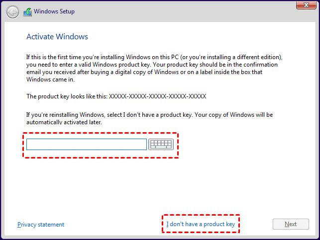 - Next you will be asked to enter the product key (you can also skip this step by clicking on the I don't have a product key option). Next, you will see the license terms, choose to accept it and click Next.