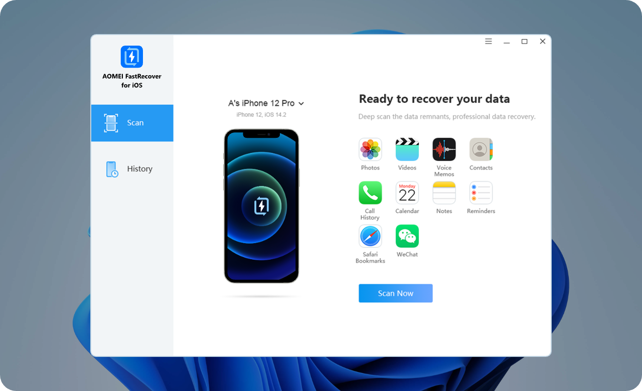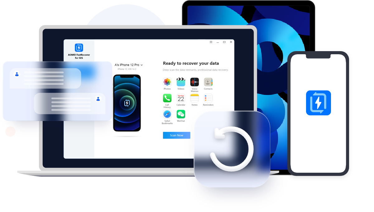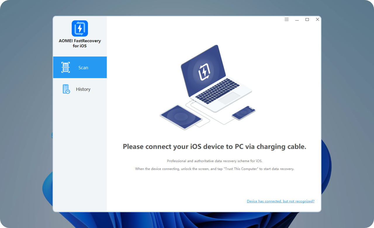 Install AOMEI FastRecovery for iOS on your PC. Then run data recovery for iPhone within 3 easy steps - “Connect”, “Scan”, “Recover”.