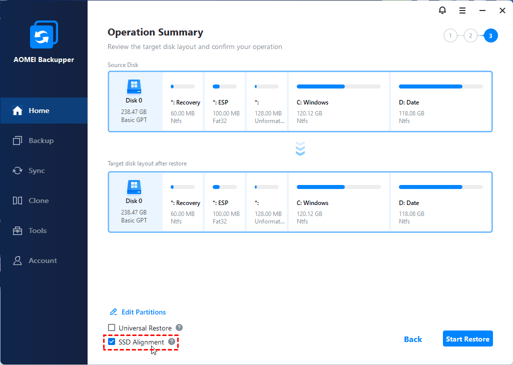 - Tick “SSD Alignment” to optimize SSD performance. Confirm the operation and click “Start Restore”.