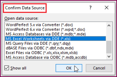 Step 4. Tick Show all checkbox. Then, select MS Excel Worksheets via DDE (*xls) to preserve the Excel file format and resolve any mail merge not working in Office 365 issues.