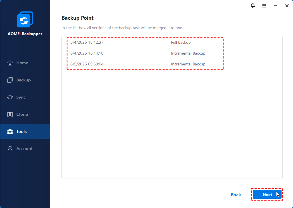 "Merge Images" can only merge all correctly sequenced incremental backup images. If this backup task contains any version(s) of a differential backup, AOMEI Backupper will remind you that you cannot merge them.