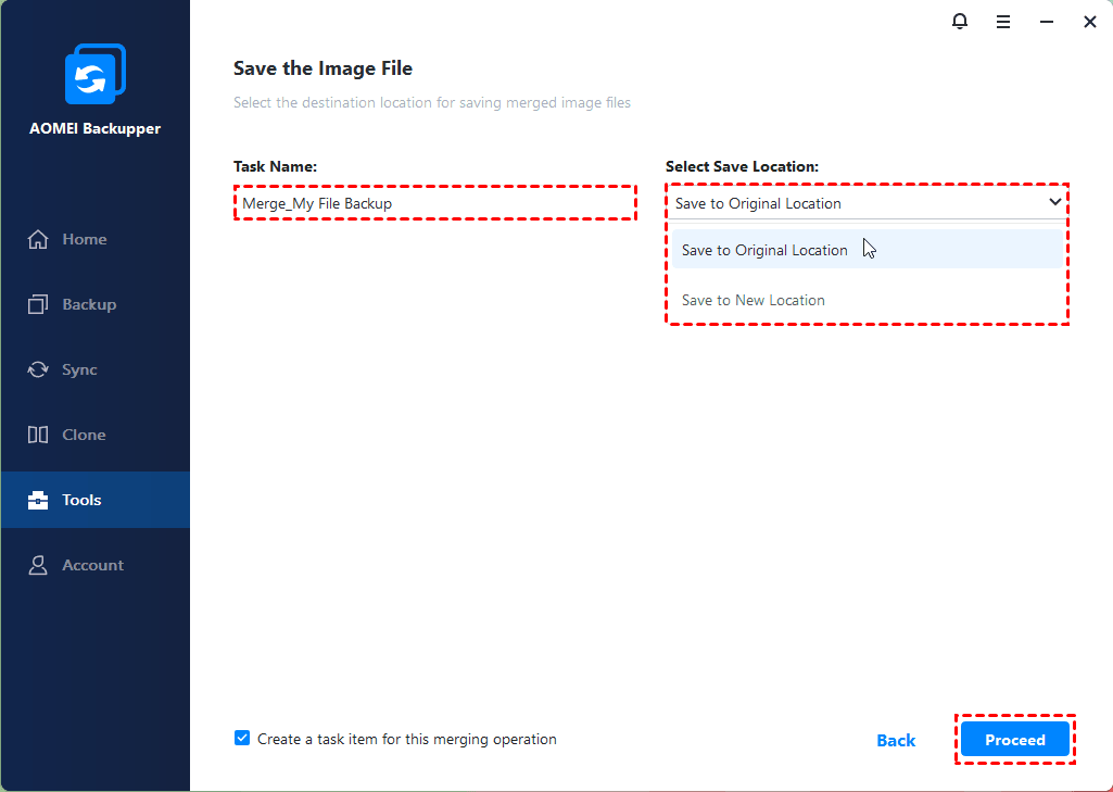 During the process of merging, AOMEI Backupper does not delete the old image files or the merged backup task.