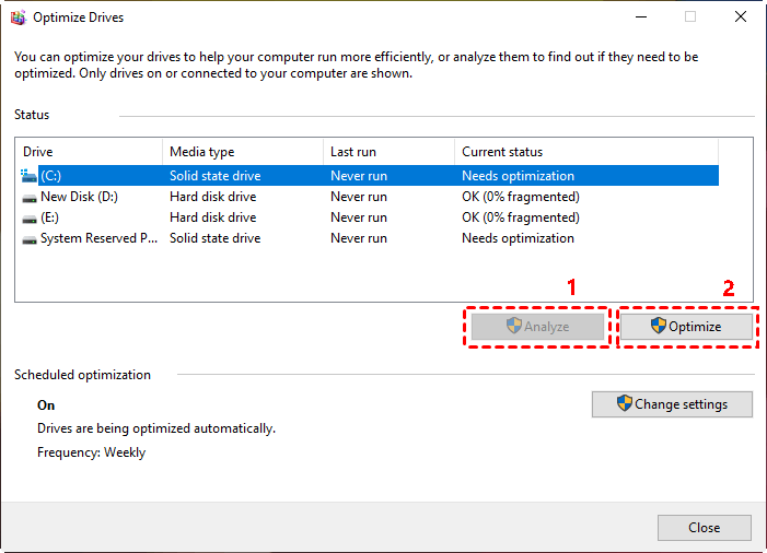 Defrag and optimize your disk. This operation can make the cloning process run smoothly. Type dfrag in the search box and select Degragment and Optimize Drives, then select the drive you want to analyze and optimize.