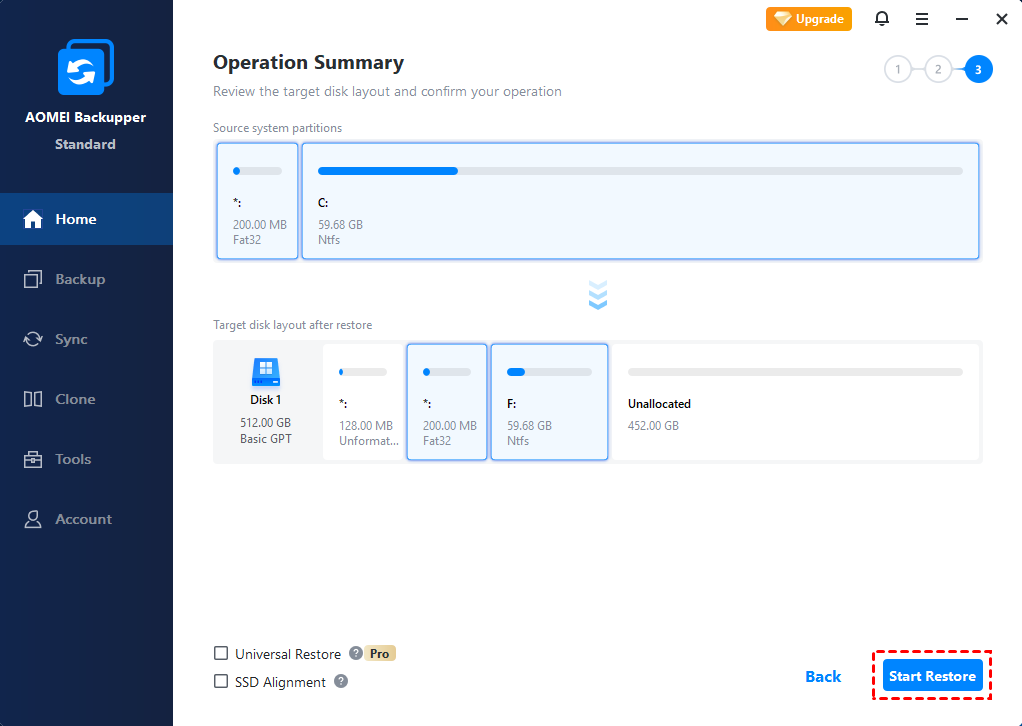 Step 6. On the Operation Summary window, check the box before "SSD Alignment" to improve the reading and writing speed of the destination SSD. At last, click "Start Restore" to start migrating OS to SSD with AOMEI Backupper.