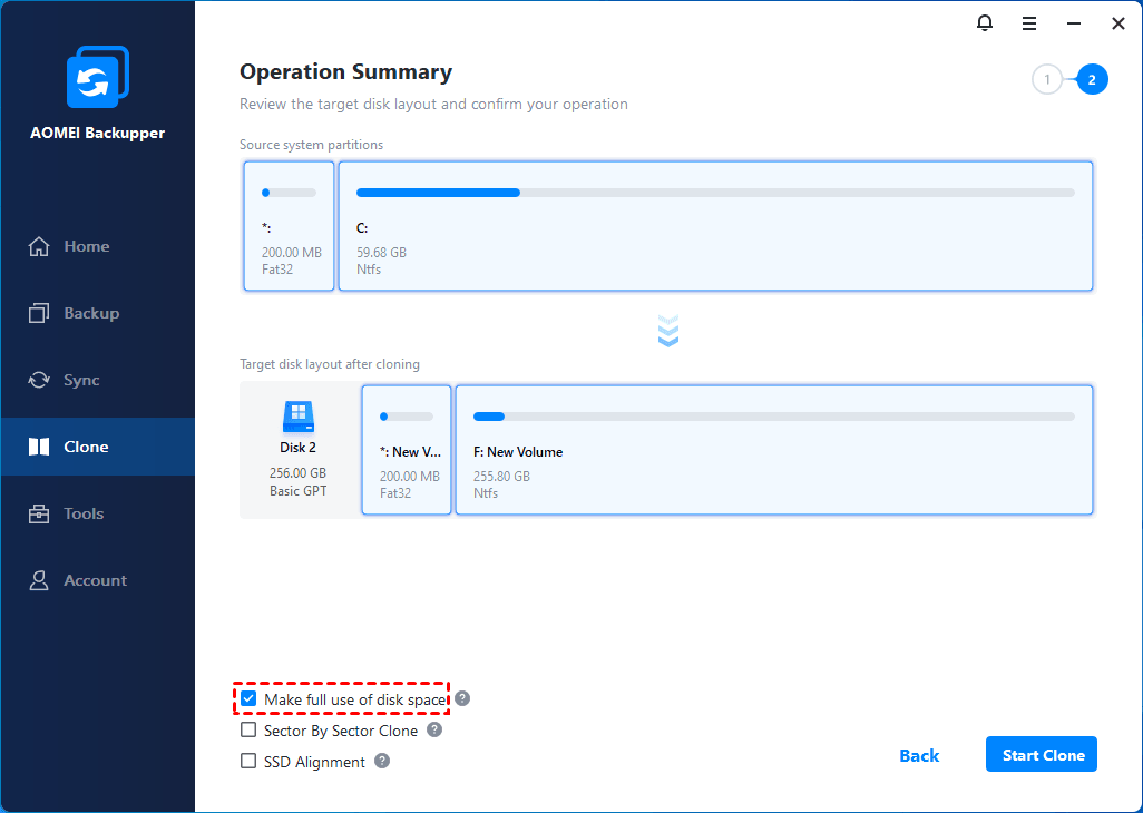 👔 Intelligent cloning - It can clone only the used space on the source disk to the target drive, useful to clone larger HDD to smaller SSD. Sector By Sector Clone is offered to copy all the sectors as well.