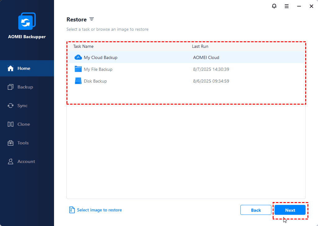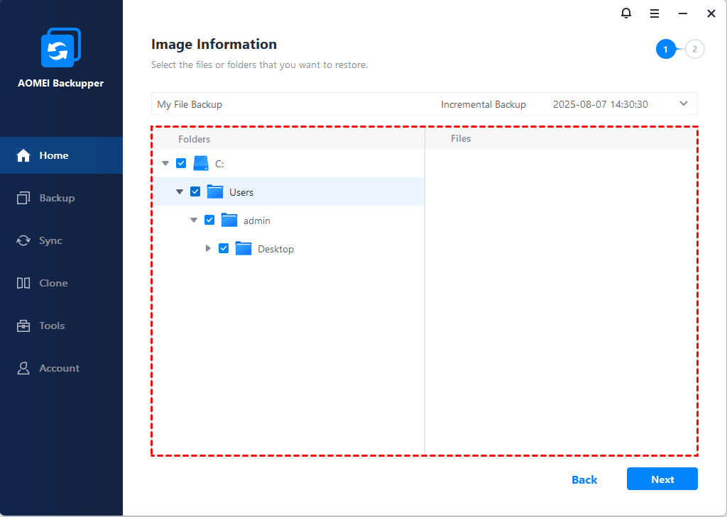 3. Select backup image you want to restore files from and files or folders in it. Then, click Next.