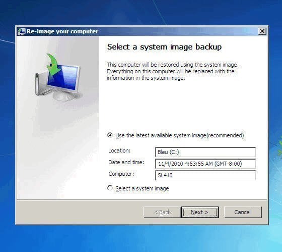 4. After that, you will see the Re-image your computer screen. Click Use the latest available system image(recommended) and then click Next. And complete the restoration process by following the instruction.