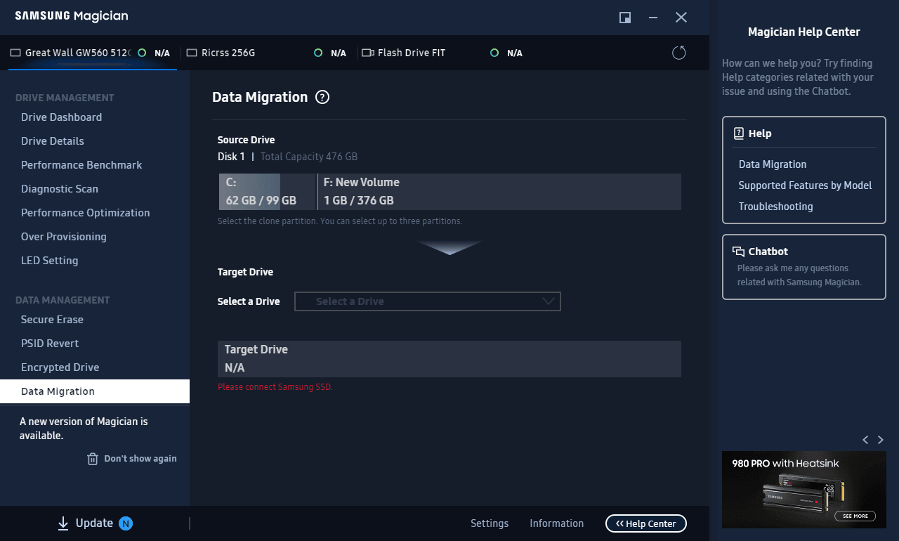 Since the latest version of Samsung Magician 8.2.0 removes the data migration feature, you can only use the old version of Samsung Magician or Samsung Data Migration 4.0. Both software can help you, but the interface is slightly different. Here are some links you can get them: