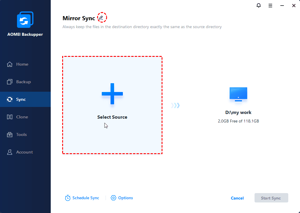 You can click the edit icon to modify the name of this Mirror Sync task to help you distinguish it from other sync tasks. Click "Select Source" to select the folders you want to synchronize. You can click the "Add Source" icon to add more folders to the source.