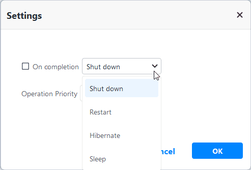 - While sync is running, you can click an icon in the lower-left corner to set to Shut down/Restart/Hibernate/Sleep PC after sync completion.
