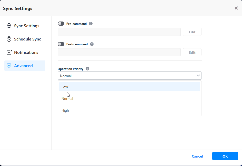 Command: In this option, you can set the pre-command and post-command so that it will run the specified program or script before or after synchronization.