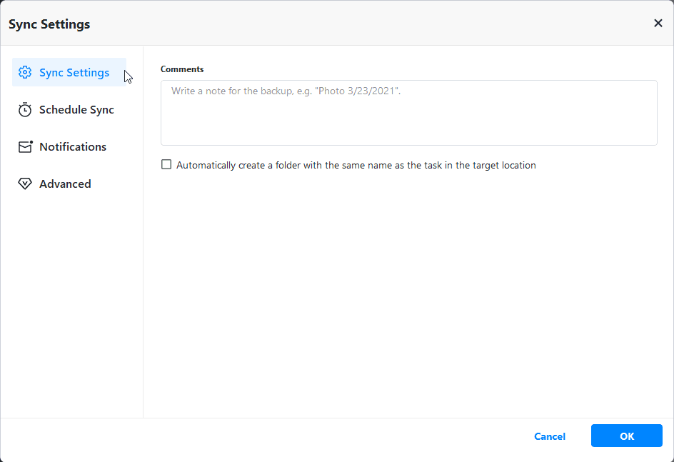 A: Basic Sync is a feature that allows you to synchronize folders to other locations, such as an external hard drive, NAS, removable USB flash drive, etc. For Basic Sync, it is like the Windows "copy" feature, and it would not create an image file after the sync process is done, so you can view your contents at any time.