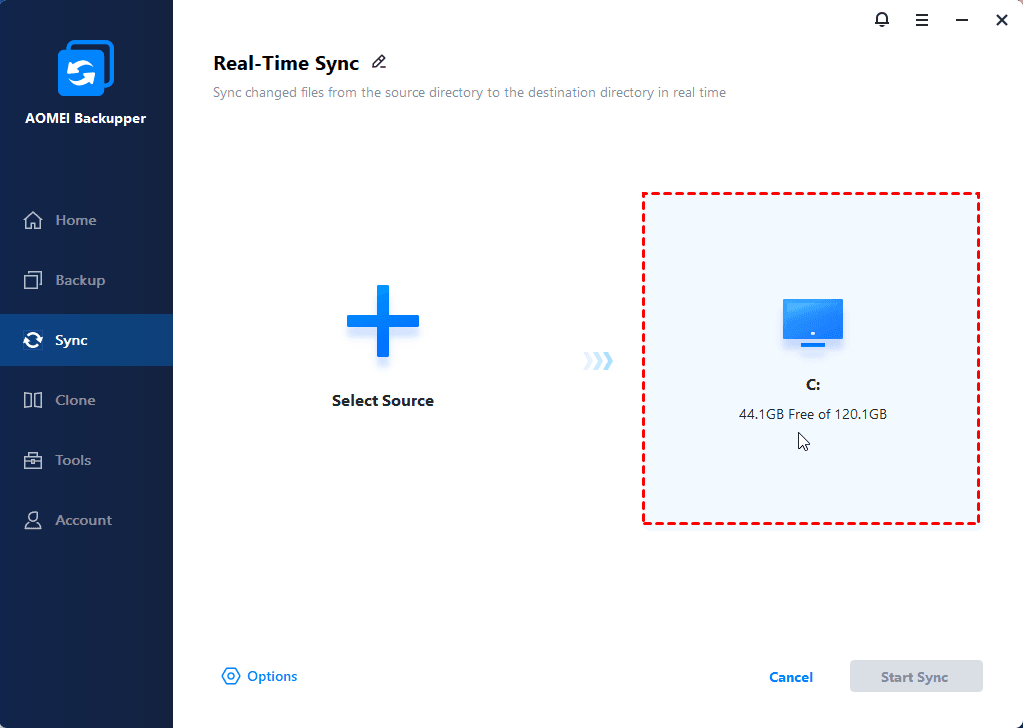 1. Install and run AOMEI Backupper. Click “Sync” on the left pane and select “Real-Time Sync”.