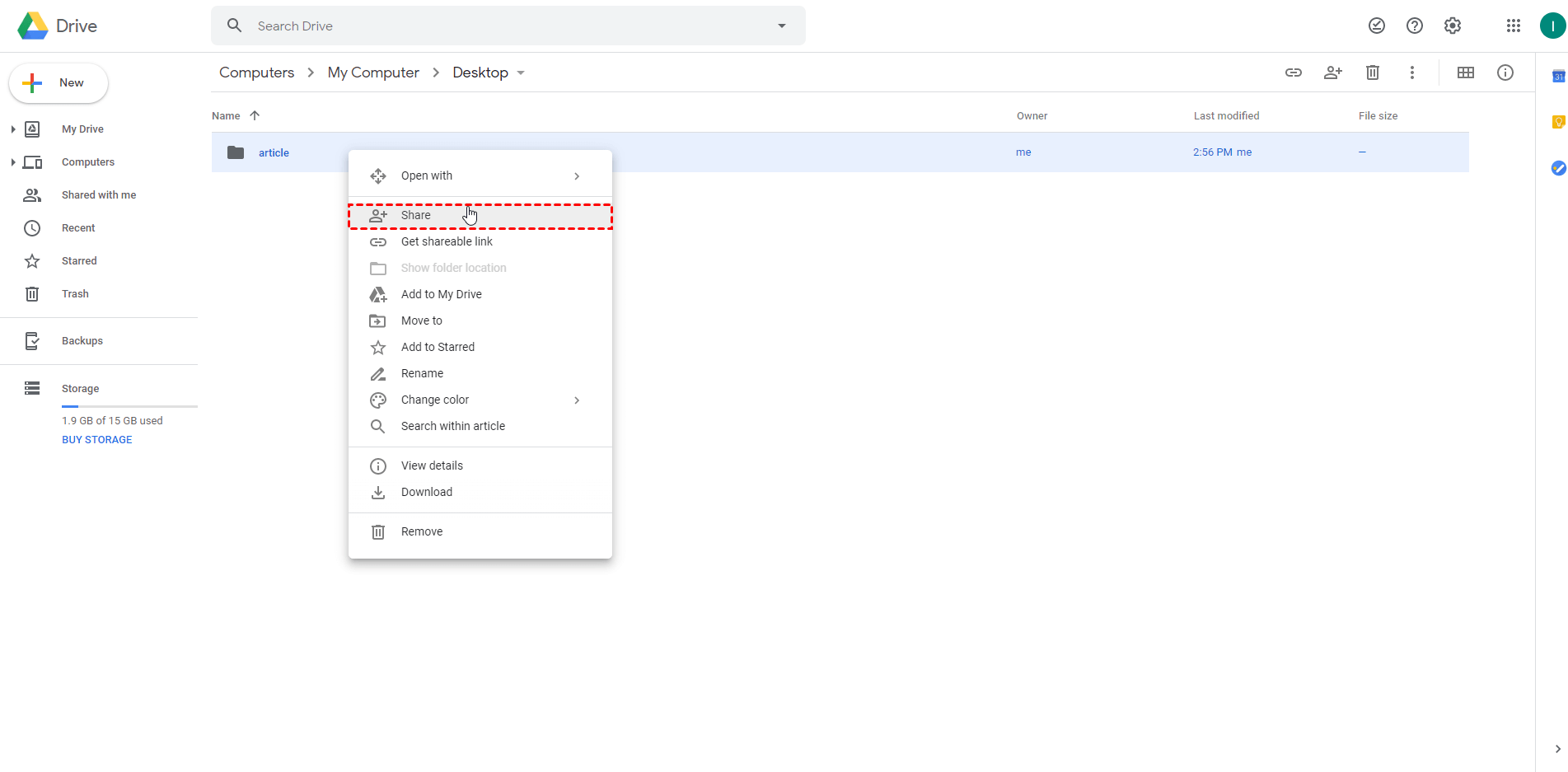 Step 2. Locate the files or folders you want to move, right-click them and select “Share” icon.