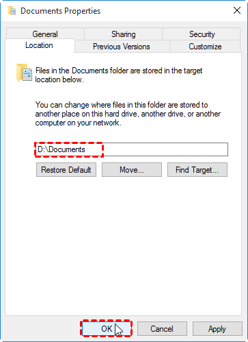 4. Click on the Location tab, and type the new path to the Documents folder (here is D:\Documents). Then, click OK.