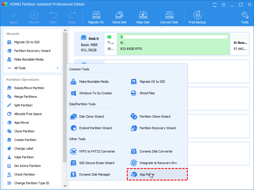 Step 1. Launch AOMEI Partition Assistant Professional. Then, click All Tools and select App Mover under the Other Tools tab.