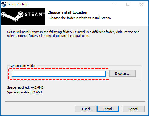 Before rerunning the Steam.exe, it's suggested to reinstall it to update all your shortcuts. Download the installer from steampowered.com and select the new location as the destination folder, here is D:\Steam\folder. Lastly, click Install to reinstall the Steam.exe.