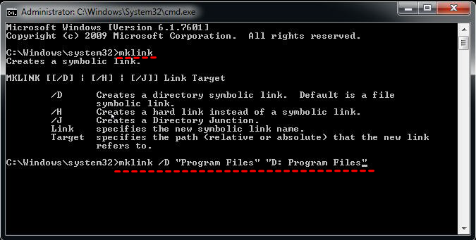 - Also, you can use mklink /J link target (called hard link) to make the files or folders appear as if they exist at the location of the symbolic link.Based on the above example, you can type as mklink /J“Program Files” “D: Program Files”.