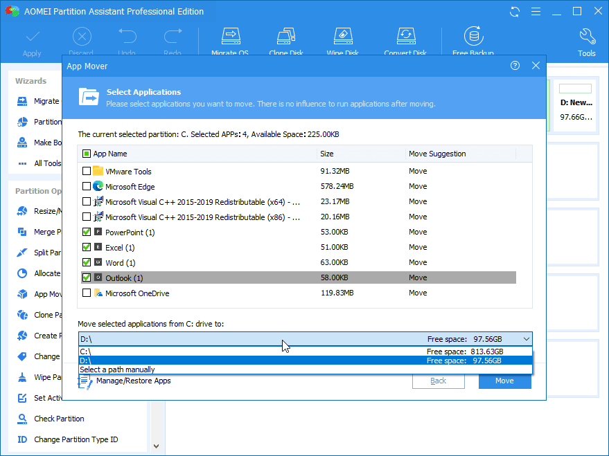 Step 3. Tick the name of the applications you want to move and choose the D drive to receive it.