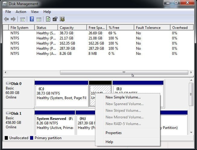 Step 1. Create a new simple partition on disk 0 with disk management.