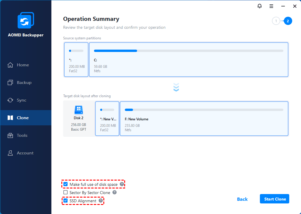If the target disk is an SSD, please tick "SSD Alignment" to accelerate the writing and reading speed of SSDs with its 4k alignment technology.