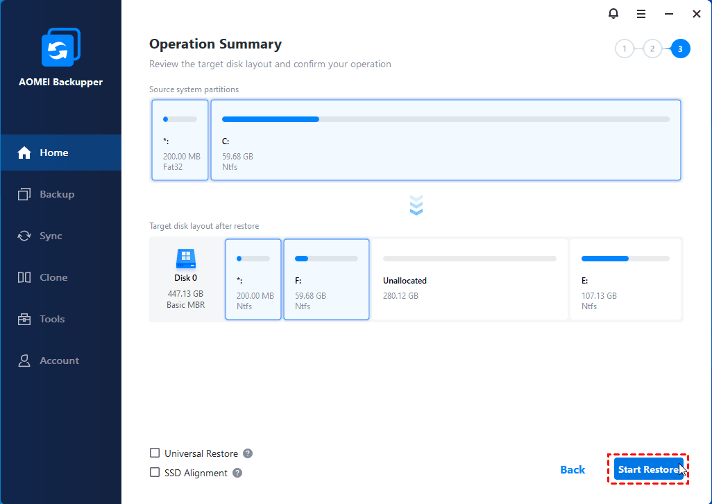Step 5. Click Start Restore to restore OS and system reserved partition to your system disk. Then, restart your computer to check if the cloned drive is bootable.