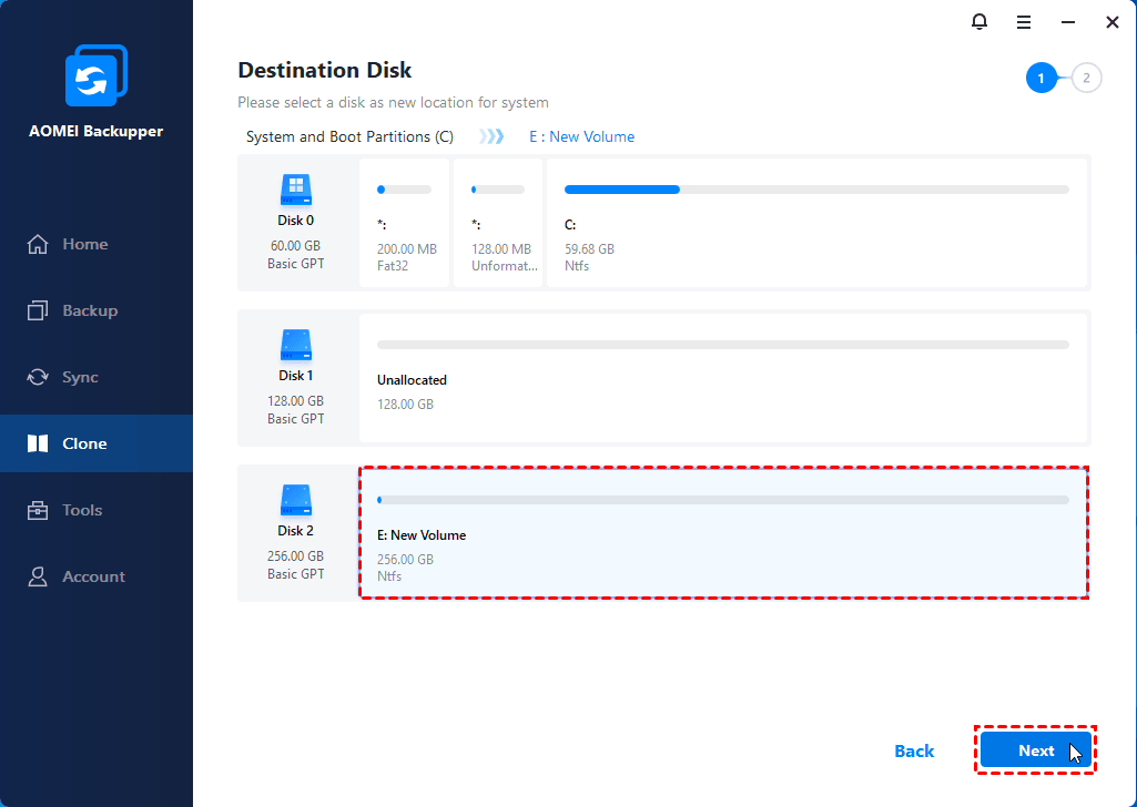 Step 2. Select another drive (or unallocated space) as the destination path, and click Next.