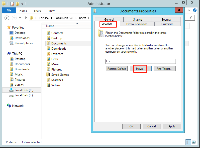 Step 4. Click on the Location tab. Then click Move to select the Documents folder in the target drive.