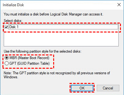 2. A pop-up will ask you to initialize the disk—choose GPT (GUID Partition Table).