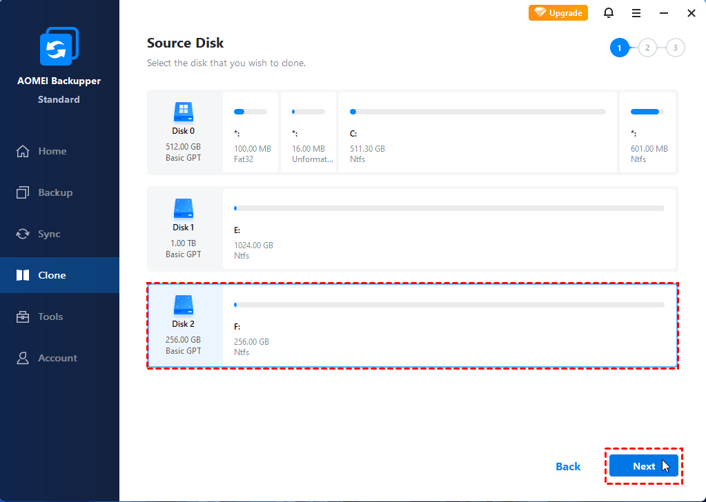 * The Standard edition only supports cloning non-system disks. If you want to clone a disk containing OS, please upgrade to higher editions such as AOMEI Backupper Professional.