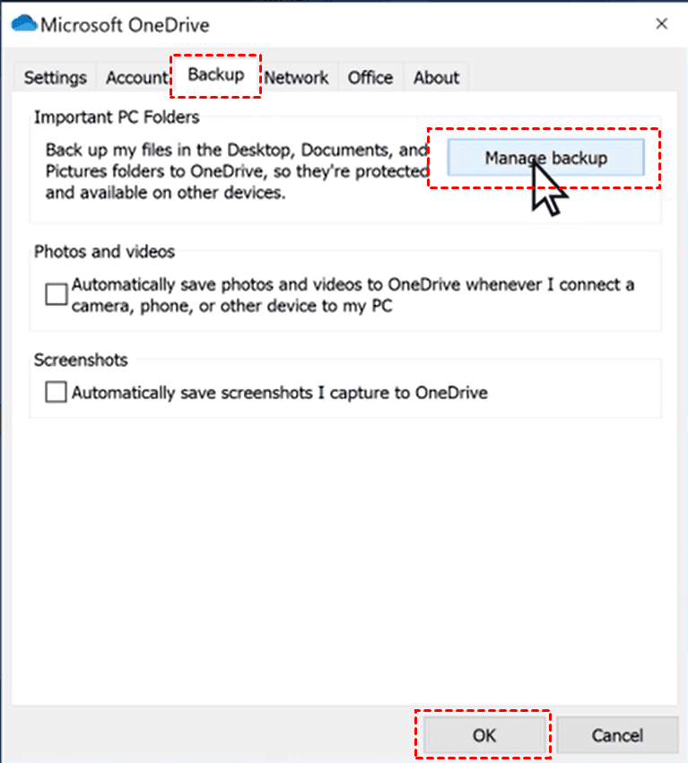 3. On the Backup tab, under Important PC Folders, select Manage backup and follow the instructions to back up your Documents, Pictures, and Desktop folders with OneDrive.