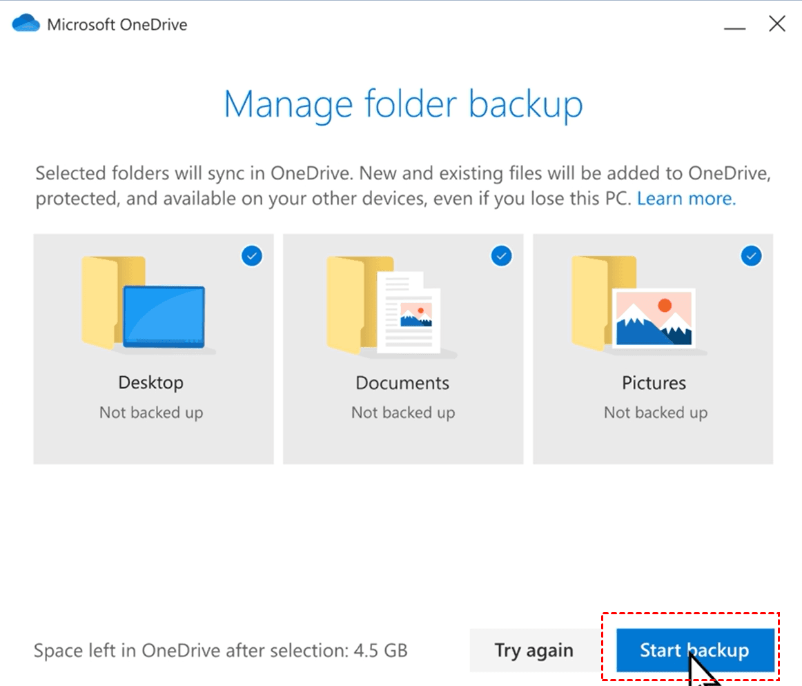 4. A new window will pop up. There, you can specify whether to backup your local Desktop, Documents, or Pictures folders to OneDrive cloud or not. Then click Start backup.
