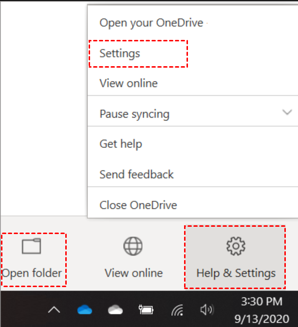 2. Double-click the OneDrive icon on the taskbar corner, then choose Help & Settings icon>Settings.